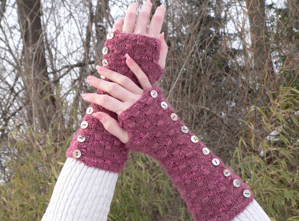 Her hand skims the tops of the heather boughs. Across the heathland she sees him walking toward her, his heavy wool sweater a splash of cream over the purple/pink blossoms. She fingers the buttons that sweep down her forearm. Will she dare to loosen a few and expose the delicate skin of her wrist, out here amongst the sunbirds and siskins where the two of them would be alone for the very first time? Only you can decide. Knit flat with a fitted construction that tapers gracefully at the wrist, Heathland Mitts can be closed or opened by a string of functional buttons that run down the pinkie side. Their future waits for your cast on.